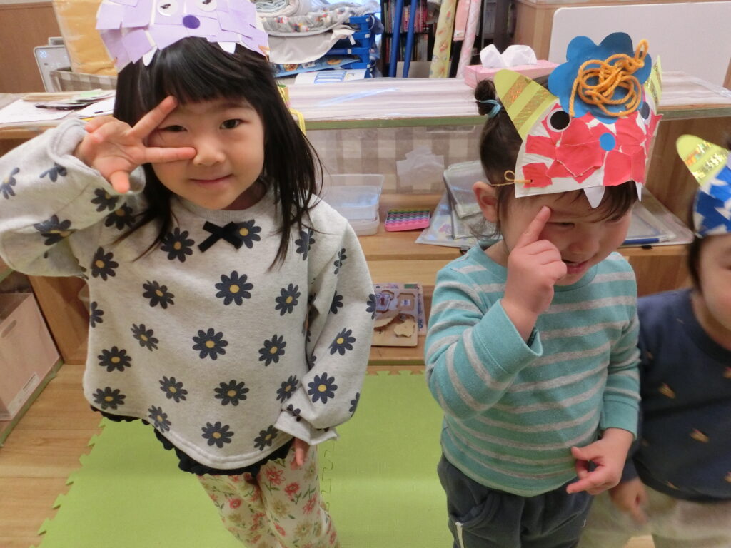 みんなカメラに向かってポーズ。『鬼は外~って言えるよ~』と豆まき会に向けて意気込んでいたお友だち。