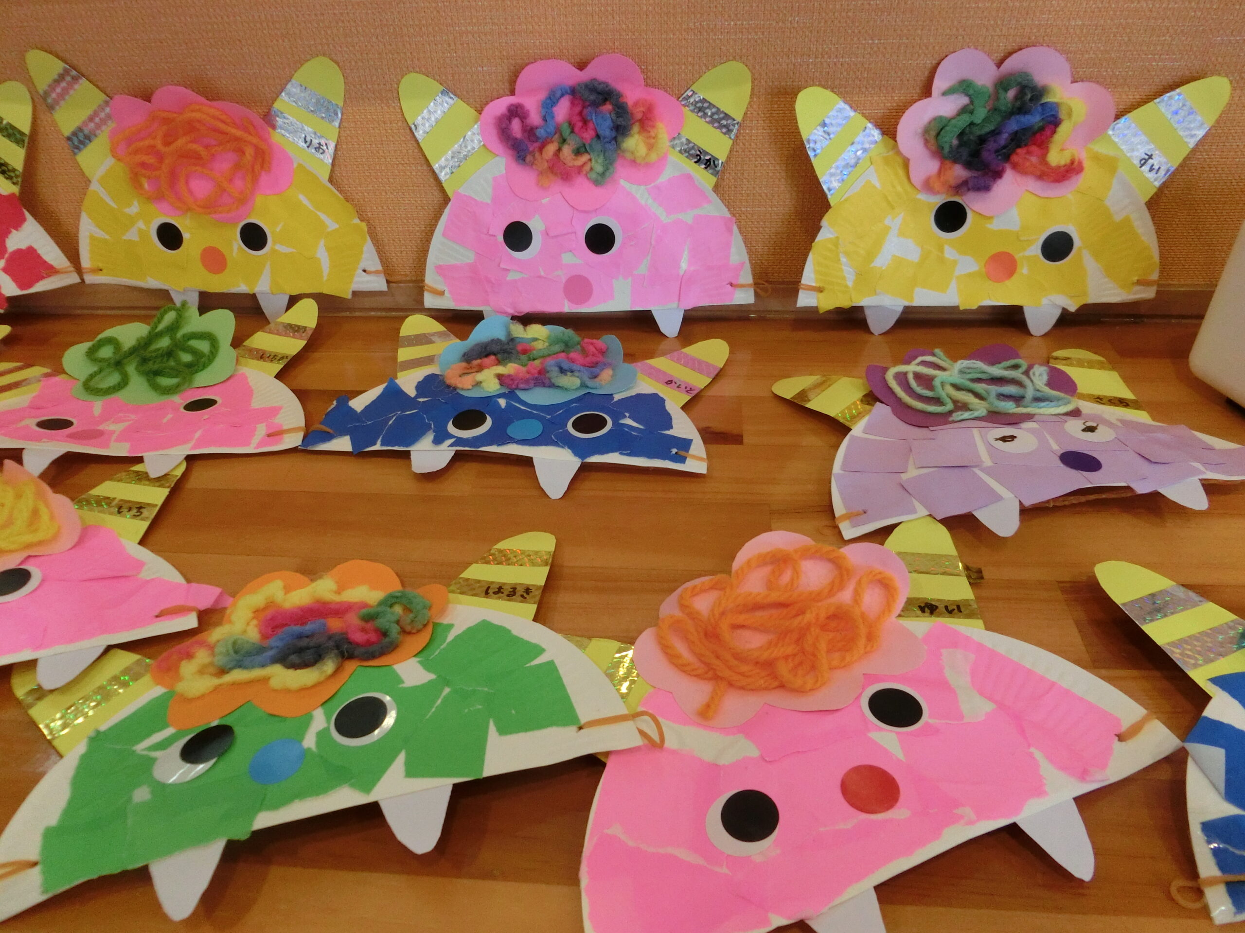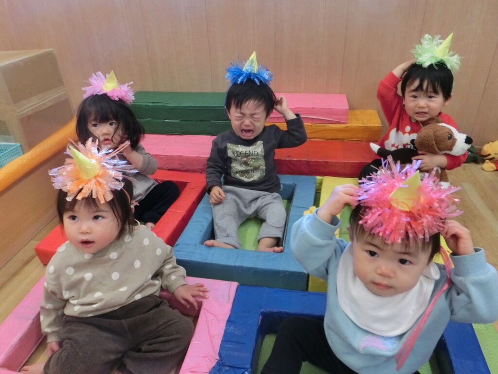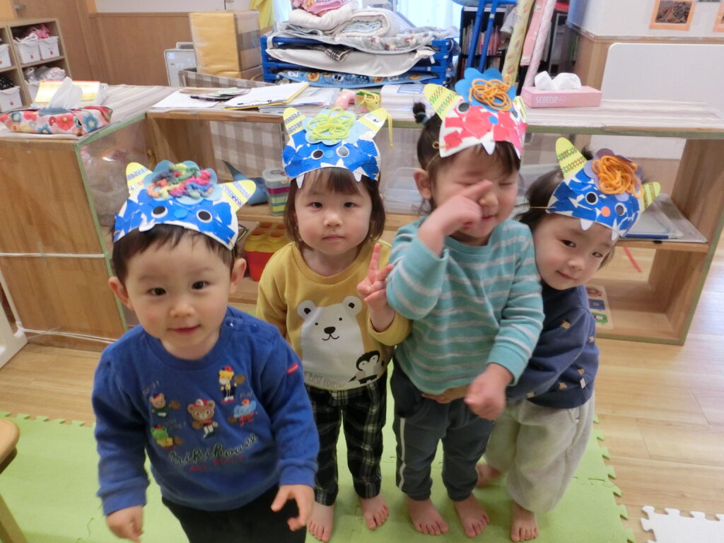 今日は節分。豆まき会に向けて各クラスで可愛い鬼のお面を製作し準備していた鬼のお面を被って集合!
