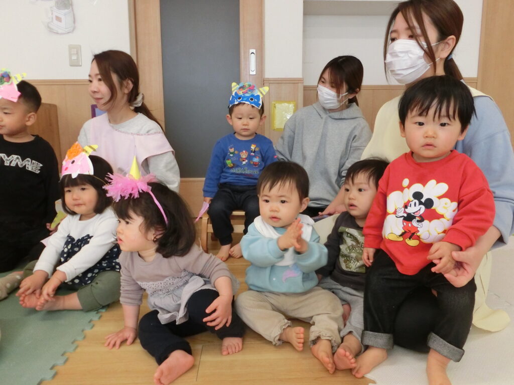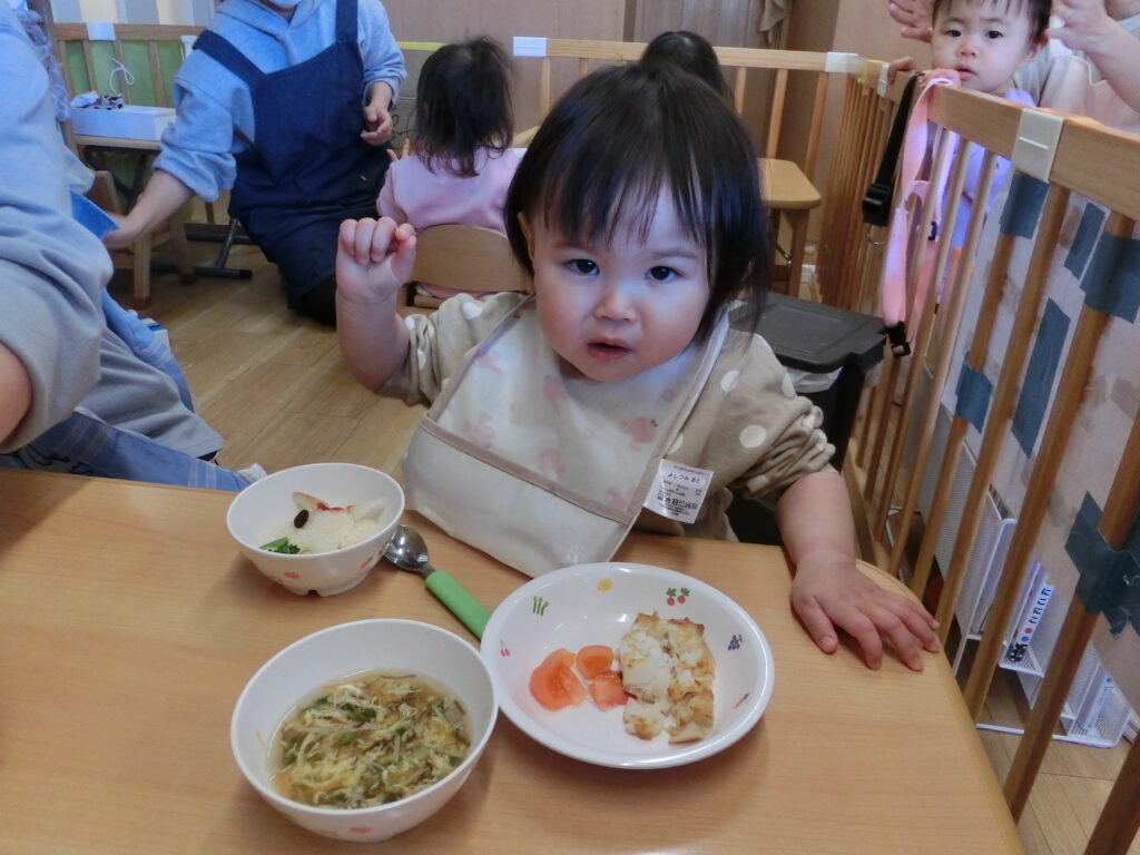 ひよこ組のお友だちは、初めての豆まき会で少しびっくりしてしまいましたが、節分にちなんだ給食メニューを