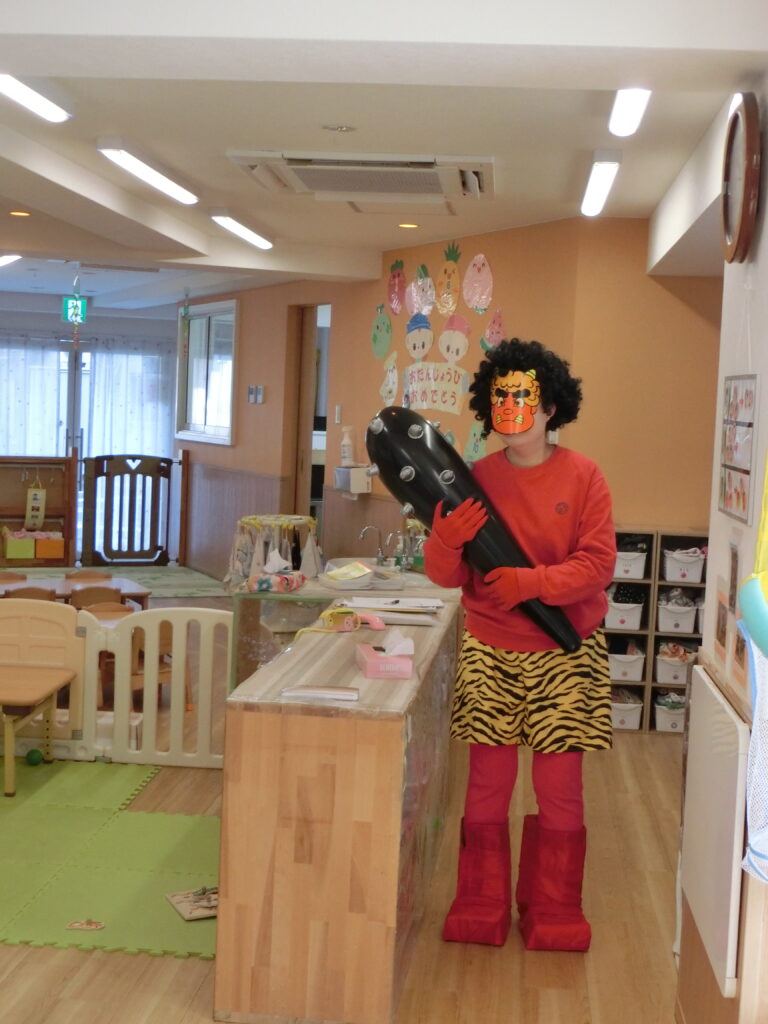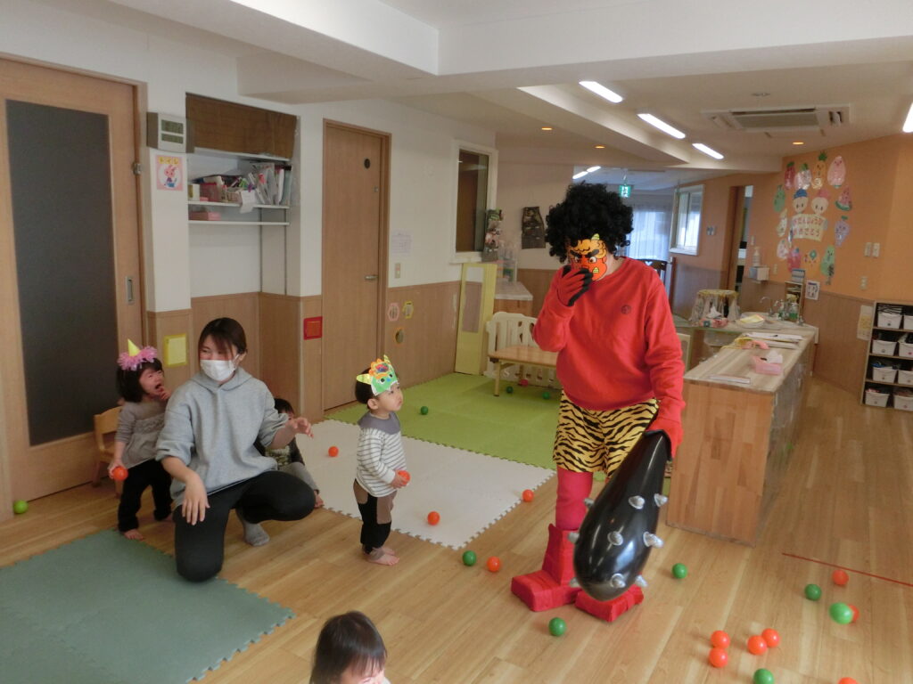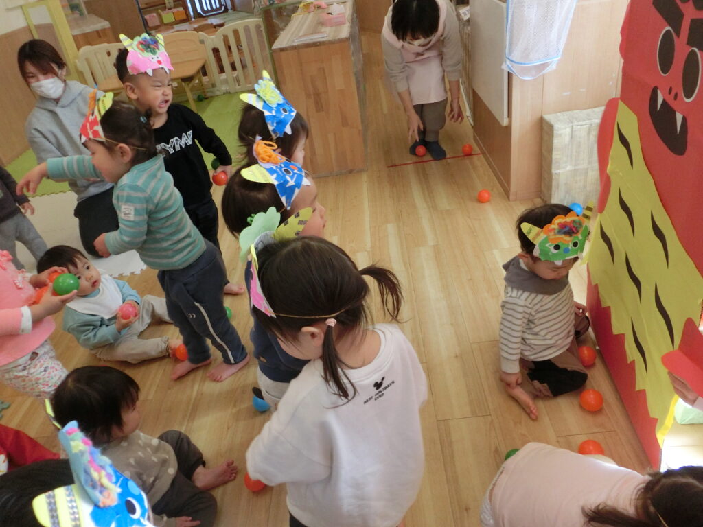 鬼の登場にびっくりしたお友だちもいましたが、豆まきボールを投げて鬼さんには帰ってもらいました。